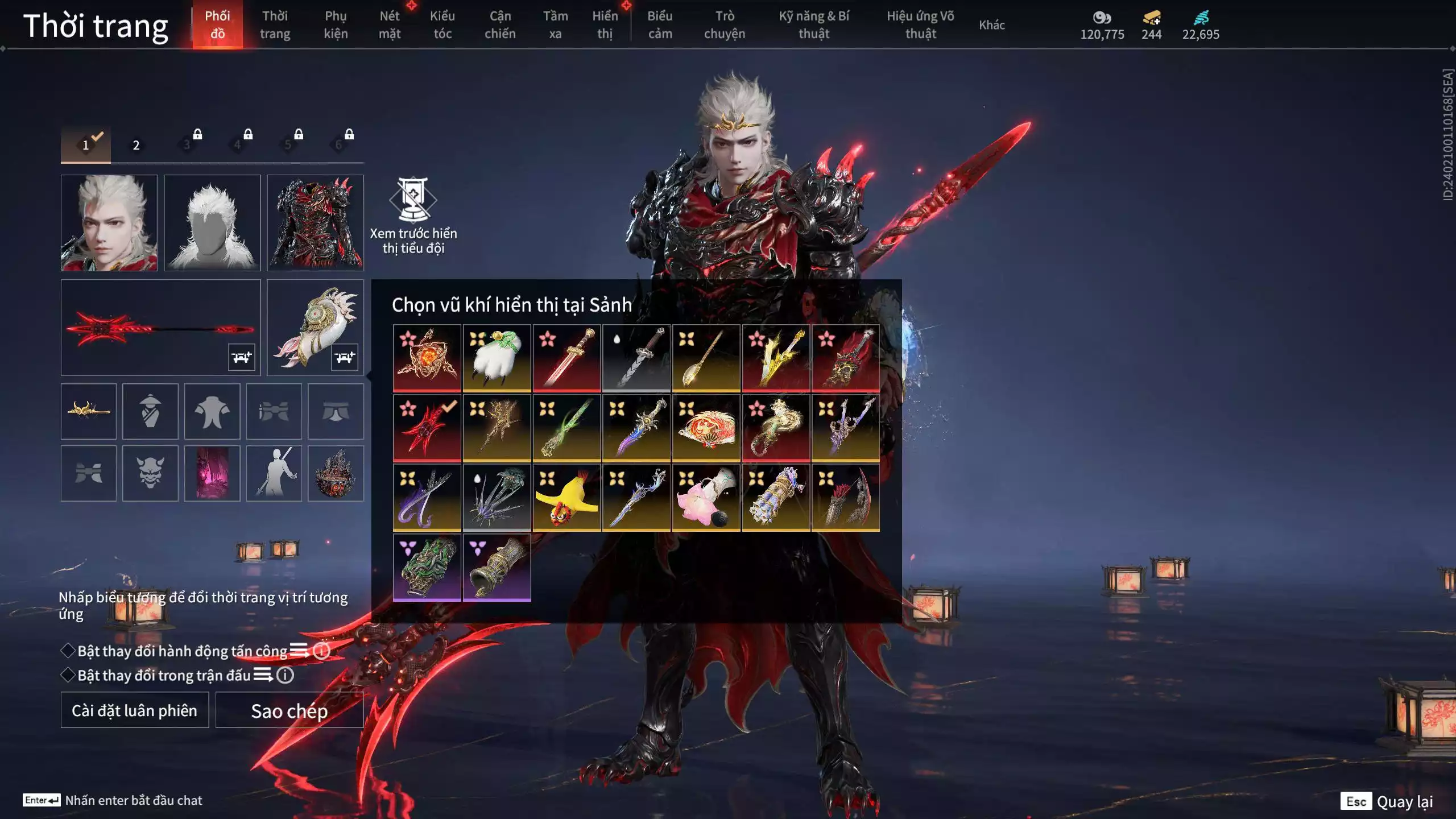 6 Vũ khí đỏ: Hỏa Luân, Kích Phi Tướng, Hoành Đao-Bỉ Nghệ, Song Long Chầu Nguyệt, Kiếm Thiếu Dương, Đại Đao Lang Vương2 Trang phục đỏ: Giám Binh Hung Thần, Hoa Của CátPhụ kiện khác: Móc mực4 Phụ kiện biến hình: Tượng Thần Điểu, Tam Oa Hồ Lô, Ấn Thần Quân, Còng TayRương sắp nổ: Bảo Long Thạch- 27 lần, Lư Sơn Hải-39 lần, Rương Đăng Tiêu-36 lầnVũ khí nâng cấp: Tỏa Hồn Trảm Oán- LV 2, Quỷ Nguyệt-Xích Hồn LV2Thời trang khác: Dạ Vẫn, Thiên Hình, Thiên Uy, Báo Tuyết, Tinh Mệnh Tử Vi, Cảnh Vệ, Lưỡi Xích Vân, Murkthorn, Bàng ThôngTóc HighLight: Ninh Hồng Dạ, Qúy Thương Hải, Takeda, Matari, Ngụy khinh, Thẩm Diệu