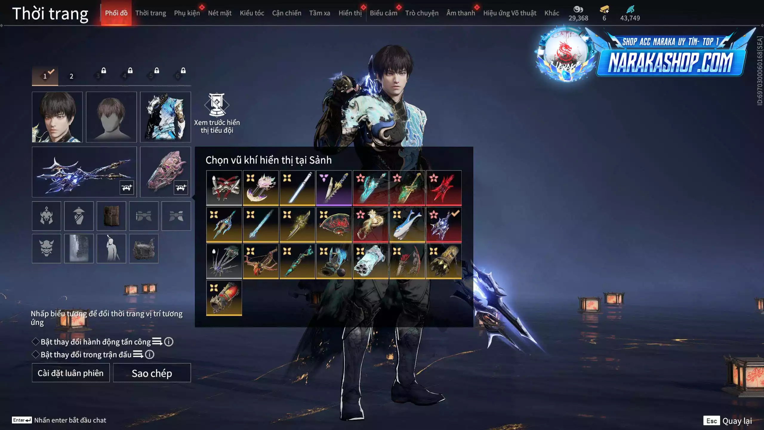 Acc 579: 5 Vũ khí đỏ: Tinh Đế, Kích Phi Tướng, Song Long Chầu Nguyệt, Kinh Bách Lý, Long Tước, 3 Trang phục đỏ: Hoa Của Cát, Thủ Mặc Kỳ, Lưu Kim Hiểu Cẩm