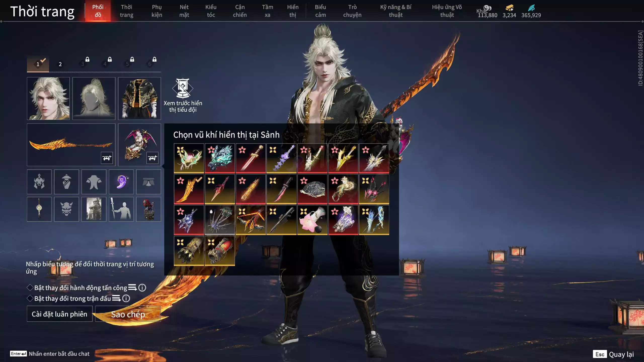13 Vũ khí đỏ: Kỳ Lân Phách, Bỉ Nghệ, Mãnh Hổ Trảm, Kích Phi Tướng, Quạt Ngọc Ngư, Gậy Như Ý, Kiếm Thiếu Dương, Thái Đao Linh Hồ, Đại Đao Nắng Gắt, Kinh Bách Lý, Song Long Chầu Nguyệt, Long Tước, Ánh Thanh Thiên