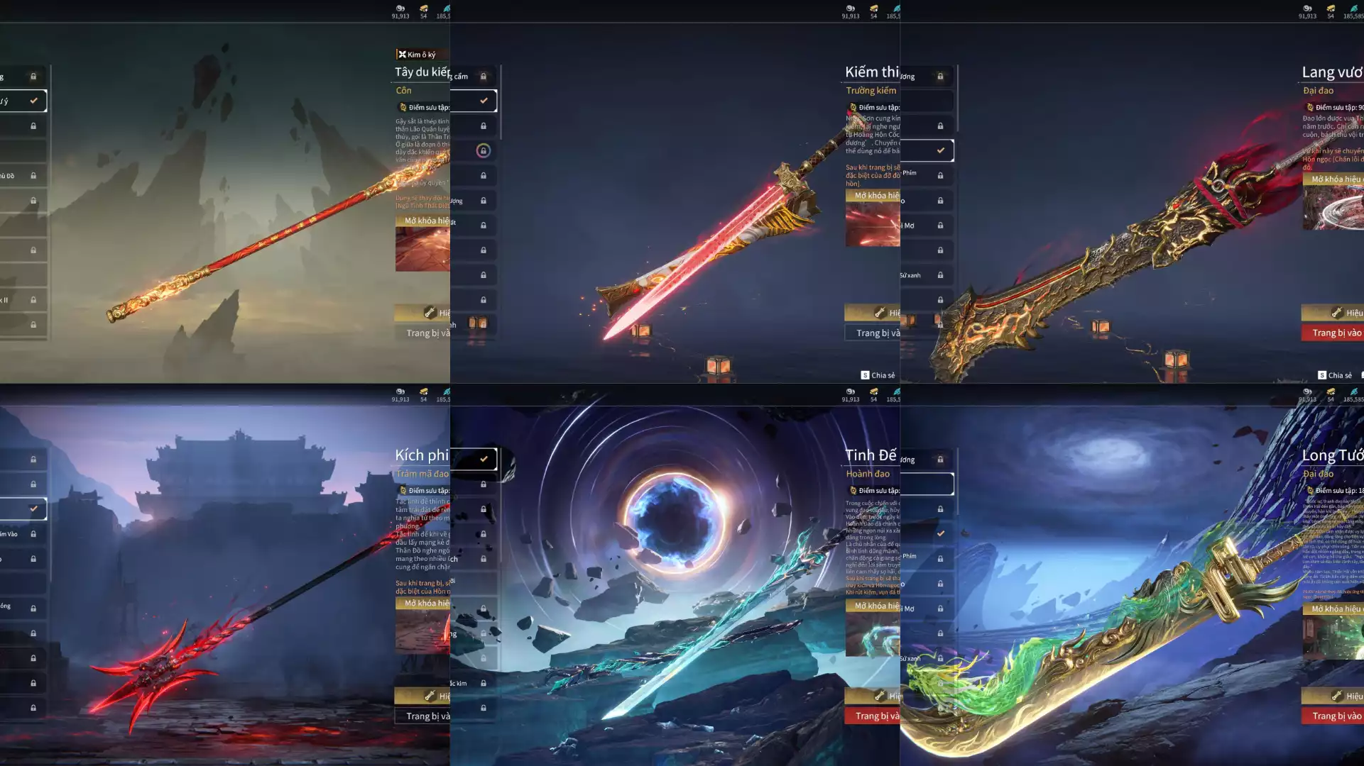 6 Vũ khí đỏ: Gậy Như Ý, Kiếm Thiếu Dương, Đại Đao Lang Vương, Kích Phi Tướng, Tinh Đế, Long Tước