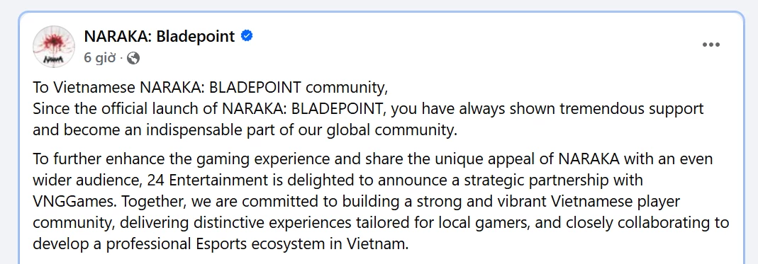 24 Entertainment đã có thông báo chính thức rằng game Naraka sẽ được phát hành tại Việt Nam qua VinaGame.